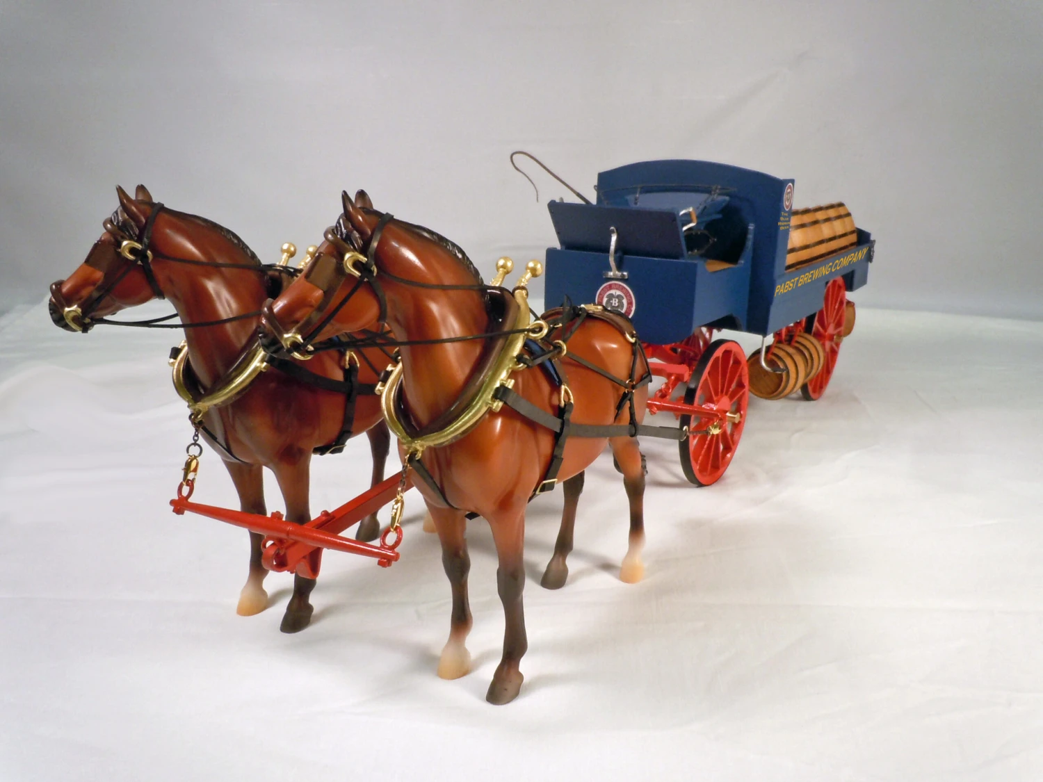 Beer Wagon kit with two 1:12 scale Breyer Horses (assembled and painted), wagon hitch, double harness made of faux leather straps, brass fittings and cast metal parts. Horse breed may vary