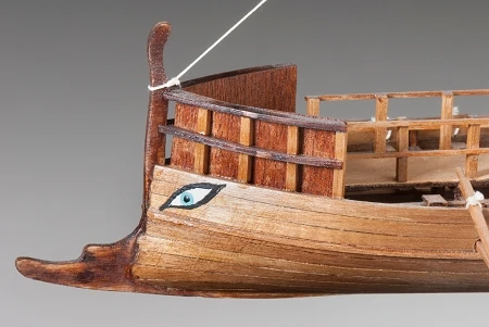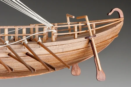The model represents the Greek bireme from the 6th Century before Christ. The garrison force was created by 50 oarsmen, who were sitting in two rows one above another (on each side 25) and by about another 10 soldiers. In the event of struggle the oarsmen left the oars and skulls and fought with the shields and swords. The protrusion on the forward of the ship served for sinking of the enemy ships, the boat strove to crash by that into the hull of the adversary boat. The ship was handled by two rudders on the stern. The main drive of the ship was oared, the sail served only for longer lasting voyages. During the battle the sail together with the mast were down swept on stern and the ship was driven entirely by oars.