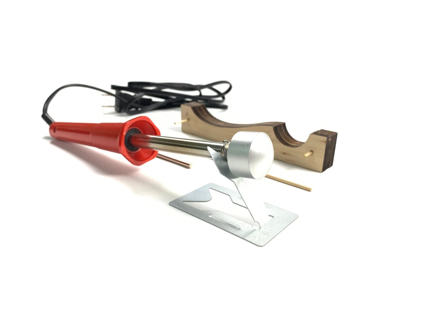 Set includes soldering iron handle with round metal head, plus a wood pattern with two different curves.