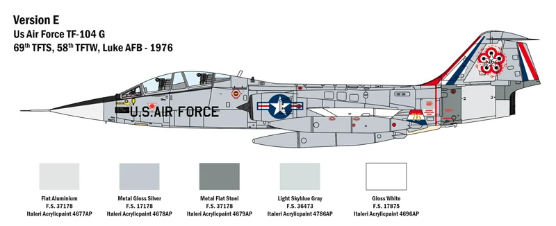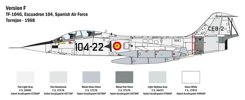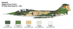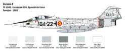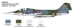 DETAILS OF THE FINELY ENGRAVED LINES AND RIVETS – MULTIPLE DETAILS, COCKPIT AND AVIONICS EQUIPMENT WITH OPEN / CLOSED POSSIBILITY – OPEN OR CLOSED AIR BRAKES – 2 DECAL SHEETS FOR 8 VERSIONS (8×4 views) – INSTRUCTIONS WITH COLOR PROFILES – 390 PIECES PLASTIC PARTS, 47 PHOTO-ENGRAVED PARTS)The Lockheed F-104 Starfighter is one of the most famous fighters in aviation history and is also one of the longest-lived with an operational life that began in the late 1950s and ended, for some military aviation, in the mid-2000s. From its aerodynamic airframe characterized by the elongated fuselage and the extremely reduced wings was created the TF-104 advanced operational training version characterized by the two-seat cabin capable of accommodating pilot and instructor. Among the most popular versions, the TF-104G manufactured by Lockheed was an essential step for pilots from Western fighter departments before completing their journey on the F-104G or F-104S single-seat interception versions. The TF-104, unlike its single-seat twin, did not have a 20mm gun. and the central pylon, but it allowed, thanks to its General Electric J79 turbojet engine, the pilot to have the same flight performance as the interceptor fighter. There are many NATO countries that have used the TF-104 such as Belgium, Holland, Norway, Spain, Turkey, Germany and Italy.