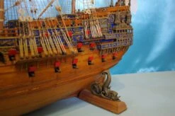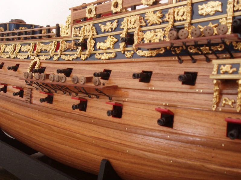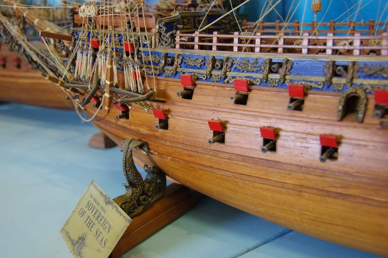 She was the most extravagantly decorated warship in the Royal Navy, completely adorned from stern to bow with gilded carvings against a black background, and the money spent making her, L65, 586, helped to create the financial crisis for Charles I that contributed to the English Civil War. Charles had imposed a special tax, the “Ship Money”, to make possible such large naval expenditure. The gilding alone cost L6, 691, those days the price of an average warship. She carried 102 bronze cannon (Charles explicitly ordered such a high number) and was thereby at the time the most powerfully armed ship in the world. Until 1655 she was also exceptionally large for an English vessel; no other ships of Charles were heavier.