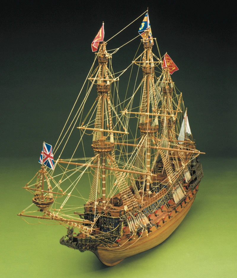 It was built by Peter Pett (later a Commissioner of the Navy), under the guidance of his father Phineas, the King’s master shipwright, and was launched at Woolwich dockyard on October 13, 1637. As the second three-decked first-rate (the first three-decker being Prince Royal of 1610), she was the predecessor of Nelson’s Victory, although Revenge, built in 1577 by Mathew Baker, was the inspiration providing the innovation of a single deck devoted entirely to broadside guns.