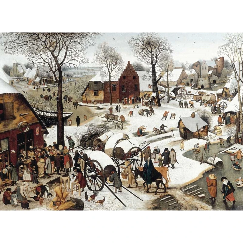 This large painting by Bruegel the Younger is exhibited at the Museum of Fine Arts in Lille. Bruegel transposes a biblical scene to his time and describes peasant life in the 16th century in great detail. On the left, a pig is slaughtered, in the background alcohol is served at the foot of a tree, children are playing… all in a vast snowy landscape rich in detail!