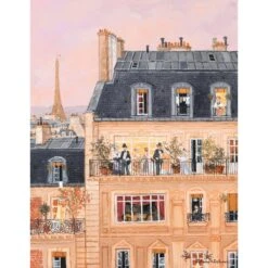 Fabienne Delacroix is ??a French figurative painter who lives and works in Paris. She is inspired by the 19th century to create scenes in a naive style, like so many stories that she tells us through numerous details. In this painting called Chez Madame, the artist represents the facade of a Haussmannian building giving a glimpse of the life of the inhabitants.
