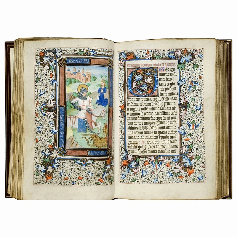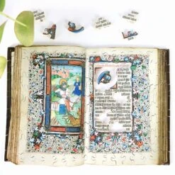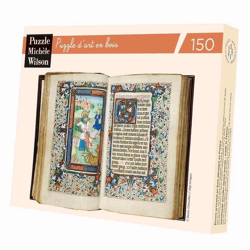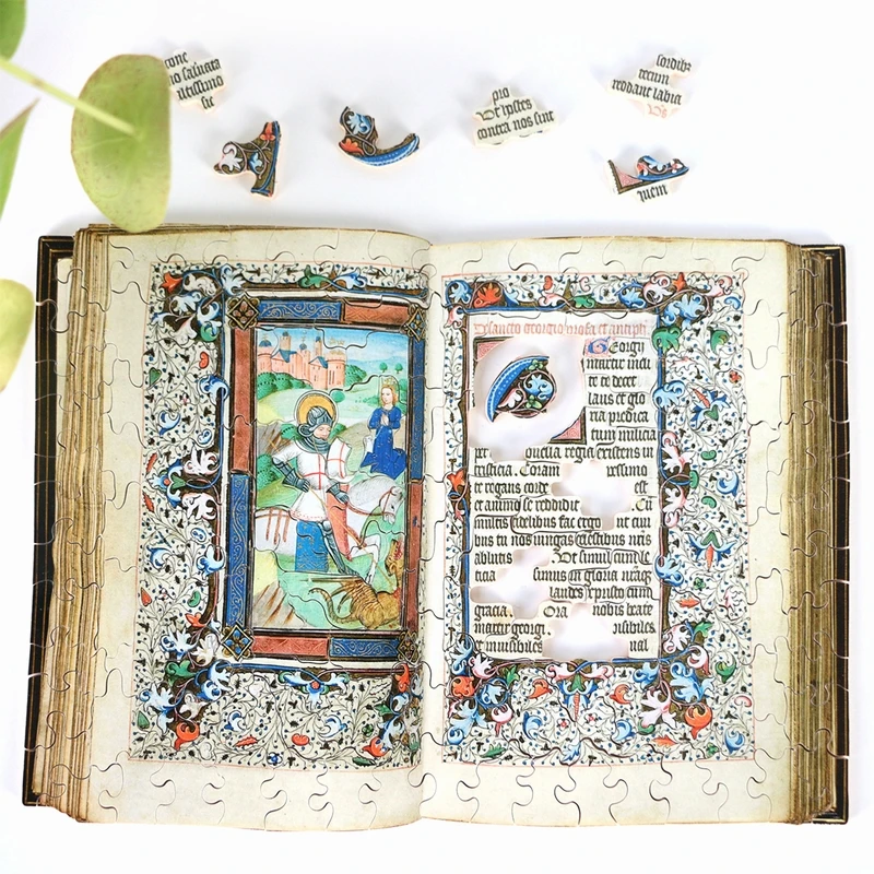 Taken from a Latin Book of Hours, this illuminated manuscript is dated to the 15th century. The left page represents the legend of Saint George and the Dragon. The saint fights a dragon who was about to devour a princess. The cut of this puzzle follows the contours of the old book.