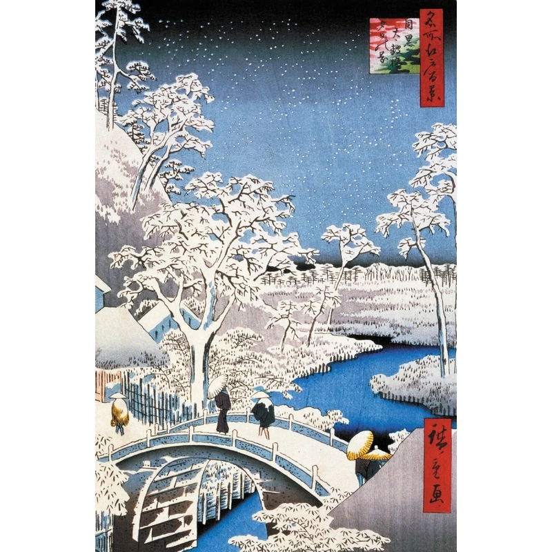 This view of the Meguro Bridge is part of the series of 100 views of Edo in Japan. It is in a private collection in France. Hiroshige began this series at the age of 60, which shows the city of Tokyo (Edo) through the seasons. Success led him to make 118!