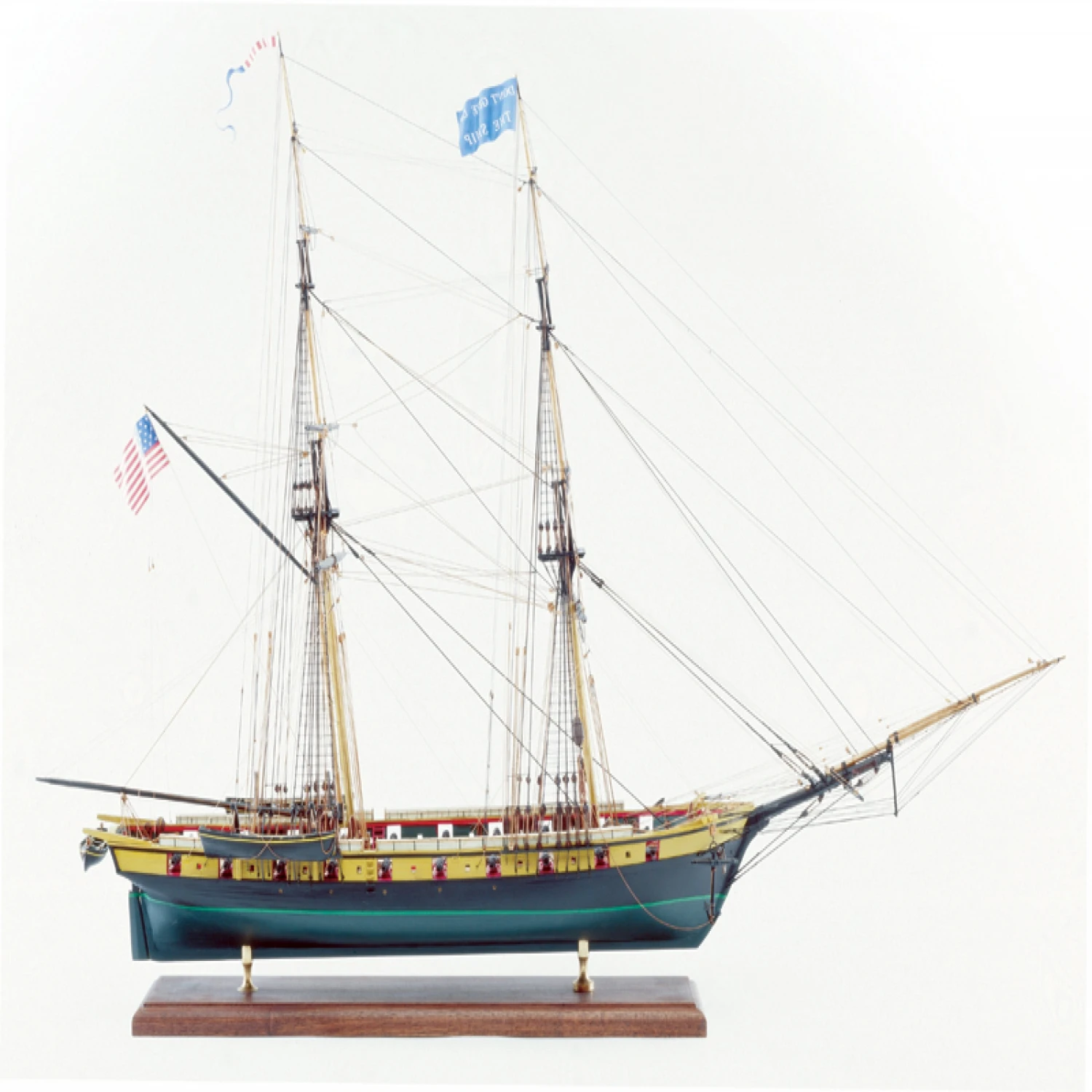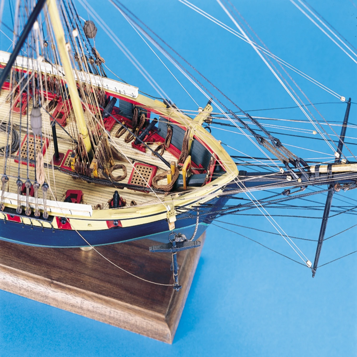 Individual basswood strips cover the hull, and we provide six filler blocks in our Model Expo Niagara to make the job easier. True-to-scale Britannia metal, brass and hardwood fittings assure scale accuracy. Eighteen cast metal carronades and two long guns duplicate the armament of the original vessel. Rigging material include over 600 blocks and deadeyes and four diameters of rigging line. Six sheets of detailed plans and 40 page illustrated instruction manual by Ben Lankford clarify every phase of construction. (Display base and brass pedestals not included.)