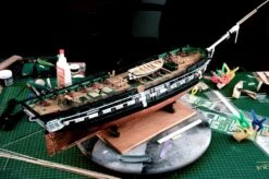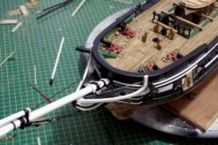 The Model Shipways kit is relatively easy to build with plank-on-bulkhead construction, thanks to its 20 sheets of CAD-assisted laser-cut basswood parts, which come in a variety of thicknesses from 1/32” to 3/16”. Fine basswood is also used for hull and deck planking. An unusual feature of this model is that the fully detailed gun deck is left visible for dramatic exhibition through the partially planked main deck.