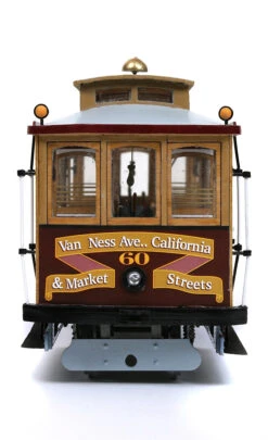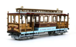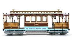 San Francisco’s cable cars are an authentic icon of the city. The first cable cars of this kind were brought into operation in London and, many years later, on 2nd August 1873, Andrew S. Hallidie introduced the first San Francisco cable car, on the Clay Street line.136 years later these attractive vehicles are still running on the streets of San Francisco and form an essential part of the city’s daily life.The system is based on a cable that is pulled at a constant velocity, along the whole route, by a stationery engine. The cable car starts to move when a device, called a grip, is engaged under pressure to the cable. By loosening this grip, and at the same time applying the breaks, the car is brought to a halt.These days there are only two fleets still in service. One of these is Powell-Hyde and Powell-Mason, while the other is California Street. This model is a reproduction of car No. 60, of the California Street fleet, built by MUNI (San Francisco Municipal Railway) in 1998 this car was brought into service in 2002.This car is based on the original model, built by John Hammond & Company for the California Street Cable Railroad Company, back in 1906. After the earthquake and the fire, of April 1906, it was rebuilt, at the relocated Hammond workshops and renumbered No. 16, later on, in 1957; it was renumbered again as No. 60, by MUNI.The cable car was finally renovated again in 1968-69, at the MUNI Elkton workshops, using the original seats and roof.You will find out, step by step, how to put together a model featuring all the details of the original carriage. We invite you to let yourself get carried away and set up spaces for creative leisure in which you can enjoy this marvellous model train.SCALE 1:24 / G-45HEIGHT 160 mmWIDTH 107 mmLENGTH 428 mmDIFFICULTY Medium