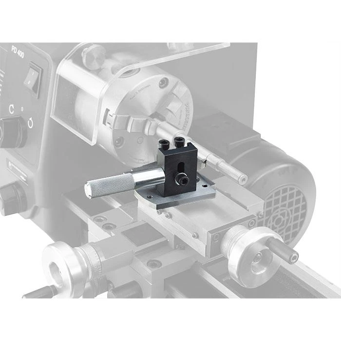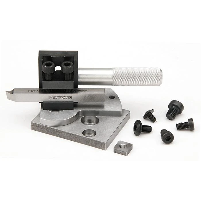 Is mounted on the cross slide in place of the tool holder. For producing convex and concave shapes, for turning radii or 3/4 spheres up to max. 32mm. Height adjustable tool holder (boring tool tip adjustable from 30 through 45mm above cross slide) for use with FD 150/E, PD 250/E, PD and older PROXXON lathes. Dimensions: base plate 67 x 50mm, height 55mm. Complete with finishing cutter 8 x 8 x 80mm. In wooden box with sliding lid
