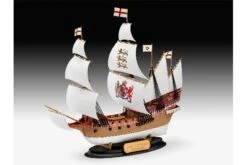 “An easy to build model construction kit of the English ship HMS Revenge. Under the command of the legendary Captain Sir Francis Drake she played a major role in the defeat the Spanish Armada in 1588. – Wood structured decking – Structured Sails – Canon – Rowing boat – Shrouds – Display stand Handicraft fun with great results for everyone age 10 or older. Quick results are guaranteed with the innovative easy-click system: Multi-colour, precisely made components fit together for a sturdy connection and decorated with stickers. No painting necessary! The model can also be painted, which makes it completely unique. A recommendation with up to 5 colours is included in the instruction manual.” An easy to build model construction kit of the English ship HMS Revenge. Scale 1/350. 67 parts. 16,3 cm length. Suitable from 10 years.