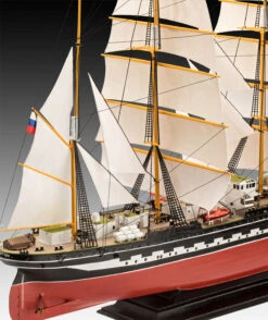 A model construction kit of the famous Flying P Liner that is still in service today. Launched in 1926 as the Padua the four-masted barque is now used by the Russian Ministry of Fisheries for training and regularly participates in international regattas.- Prefabricated shrouds- Two-part hull- Wood structure on the decking- Motor boats- Structured sails- Multi-part masts with yards- Yarn included for the rigging- Display stand- Authentic decal set