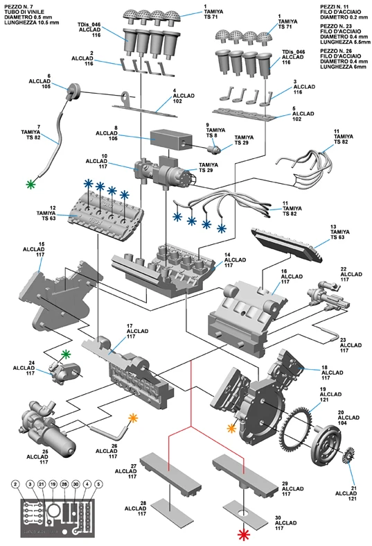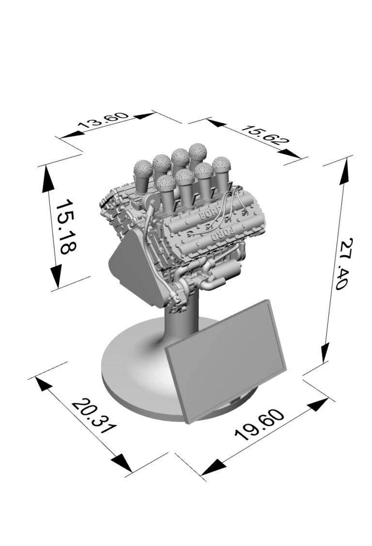 The engine is entirely cast in white metal with turned trumpets and photoetched details. In the package, we have also included the wires for the wiring. Assembly Instructions are included to complete your Build. The engine can be displayed on the included pedestal with a plate at the base Listing the technical description.