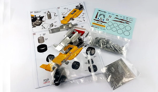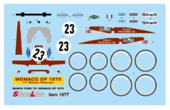 This white metal kit is a replica of a Formula 1 March 701 Ford Cosworth race car driven by Ronnie Peterson in car #23 at the 1970 Monaco Grand Prix. Kit includes photo etched parts, decals and instructions. Photos of the actual car are shown still sealed in the clear plastic packaging and may not be clear. must be completely assembled. Kit weighs 5 oz.