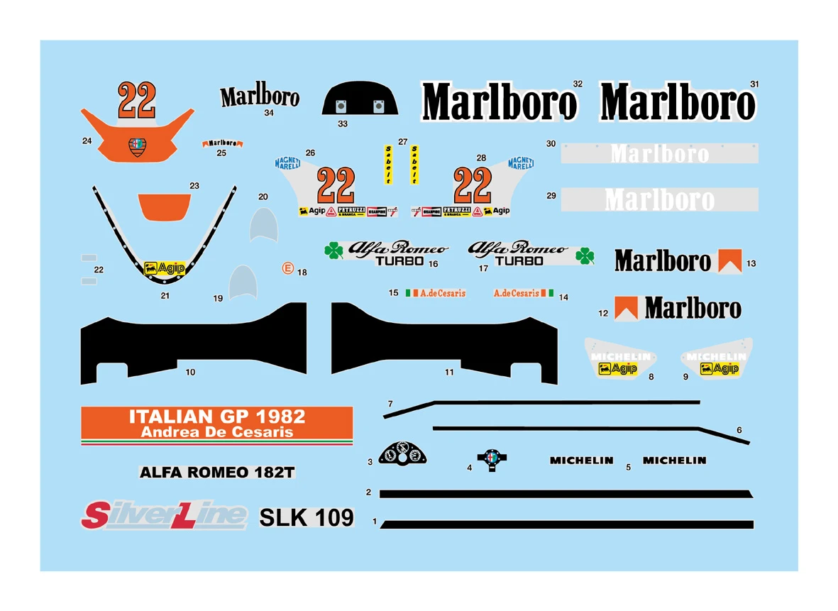 This white metal kit is a replica of a Formula 1 Alfa Romeo 182T “Practice Session” race car driven by Andrea De Cesaris in car #22 at the 1982 Italian Grand Prix. Kit includes photo etched parts, decals and instructions. Photos of the actual car are shown still sealed in the clear plastic packaging and may not be clear. must be completely assembled. Kit weighs 5 oz.