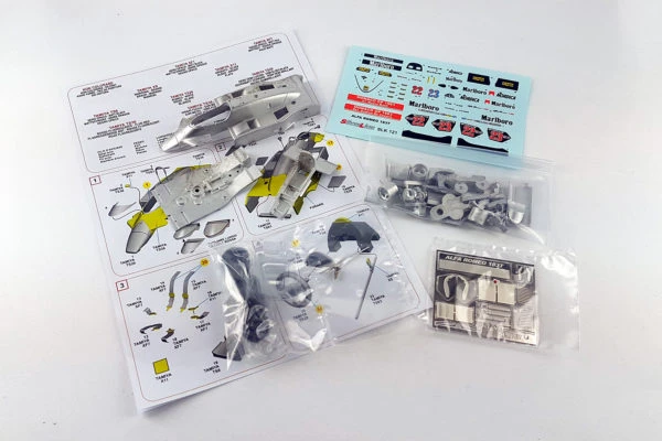 The SLK “Silverline Series” kits are produced using non-opening components and without the use of technical applications. This makes it easier for their assembly and therefore easier for the non-experienced modelling enthusiast. The kit usually consists of about 100 components. The body, the lower part of the body and the main components are cast in white metal. All the flat components are made using a photoengraving process, whilst the tyres are made of real rubber. The smallest metal parts, for example the rims, the disc brakes and the aerial, are made of aluminium and of turned brass. The kits include a full colour instruction sheet and one set of transfer decals.
