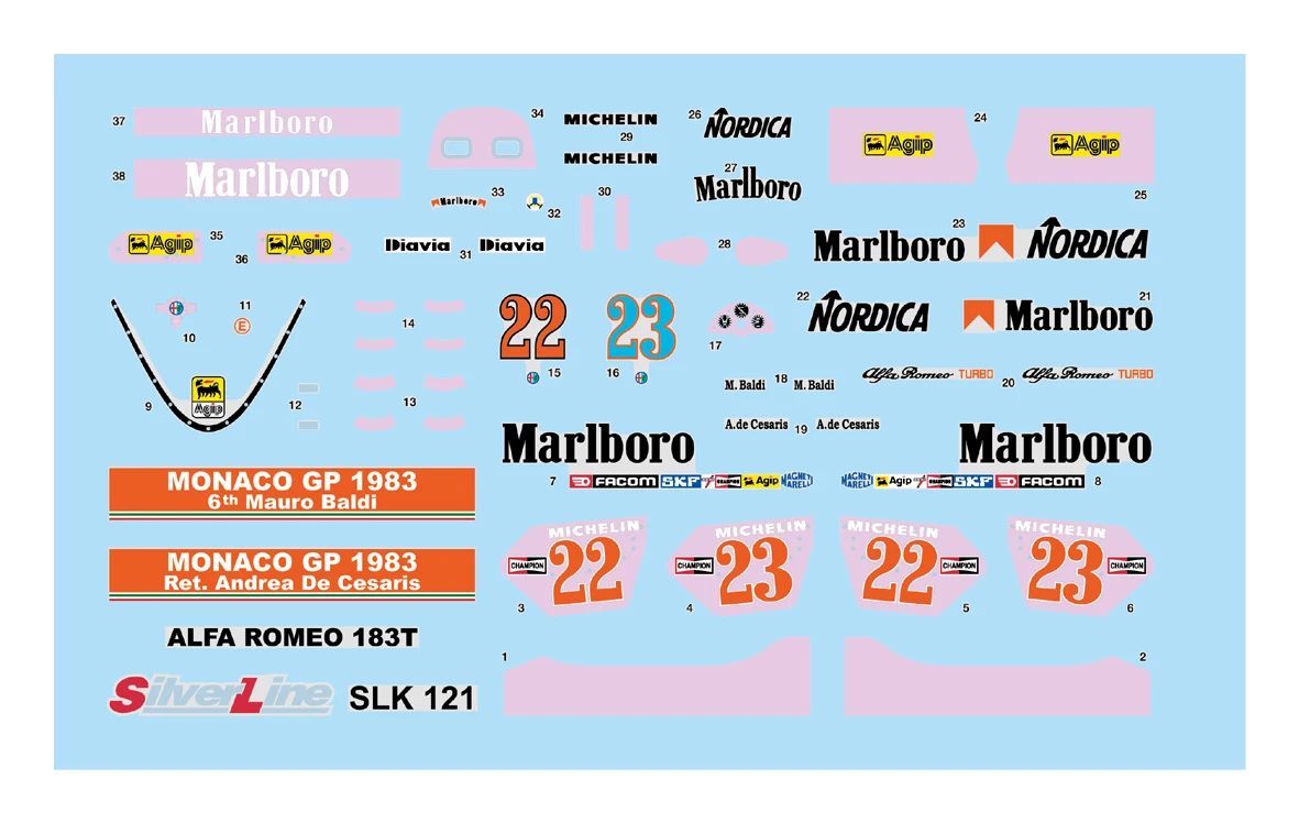 This white metal kit is a replica of a Formula 1 Alfa Romeo 183T race car driven by Andrea De Cesaris in car #22 & Mauro Baldi (finished 6th) in car #23 at the 1983 Monaco Grand Prix. Kit includes photo etched parts, decals and instructions. Photos of the actual car are shown still sealed in the clear plastic packaging and may not be clear. must be completely assembled. Kit weighs 5 oz.