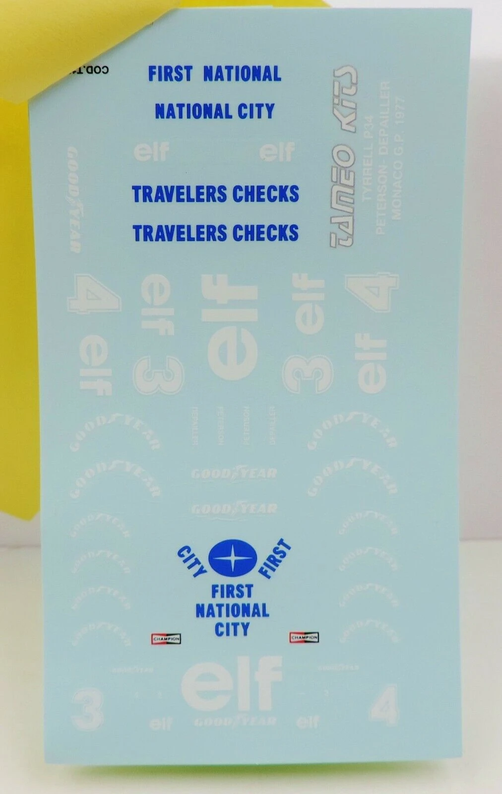 This white metal kit is a replica of a Tyrrell Ford P34/2 Formula 1 race car driven by Ronnie Peterson in Car # 3 & Patrick Depailler in Car # 4, in the 1977 Monaco Grand Prix. Kit includes photo etched parts, decals (2 sets) and instructions. Photos of the actual car are shown still sealed in the clear plastic packaging and may not be clear. Car is 3″ long and kit must be completely assembled. Kit weighs 4.5 oz.