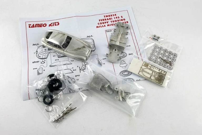 Manufactured by Tameo Kits in 1/43 scale with reference TMK034. Driven by Giannino Marzotto and Marco Crosara with number 724 Raced at the Mille Miglia in 1950. Includes photo-etched parts, turned metal parts, water slide decals, white metal parts and assembly instructions. Package measures 80 mm x 115 mm x 43 mm (width x depth x height), weighting 175 g.