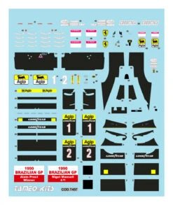 Formula 1 Ferrari F1-90 – 1990 – NIB, made in Italy. This beautiful Tameo car kit is still new in the box. This kit is a replica of the Ferrari F1-90 – driven by Alain Prost (race winner) in car #1 & Nigel Mansell (finished 4th) in car #2 at the Brazilian Grand Prix in 1990. This kit has approximately 150 parts that are produced with the most varied types of materials. The body, the bottom part and the main components of the model are all cast in white metal, whilst the other parts are produced using photoengraved metal. The smallest parts are produced by using the micro turner process. The tires are made using real rubber. A full color instruction sheet is supplied with the kit, together with a collection of photographs of the original racing car, as well as a double set of transfer decals.