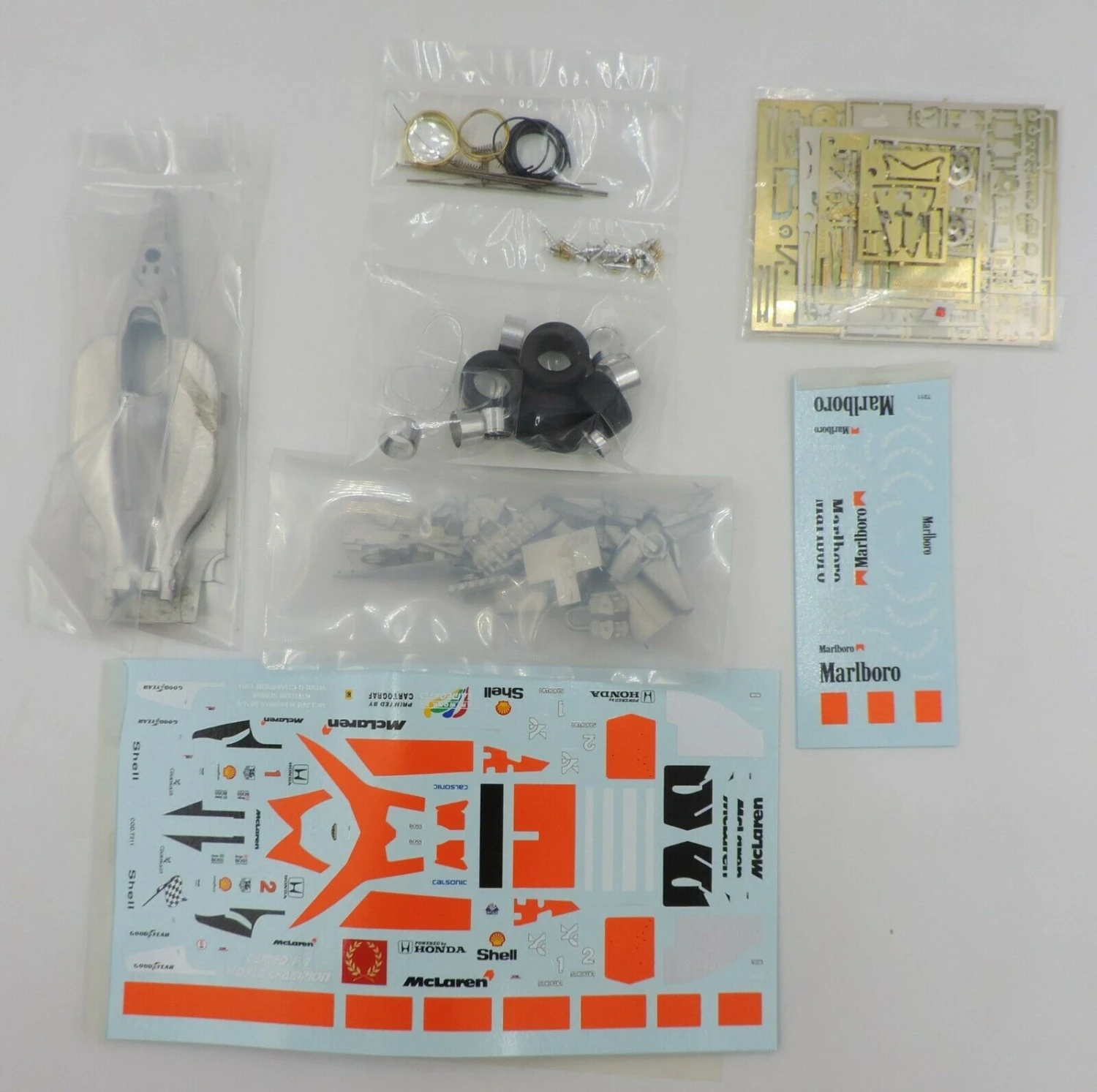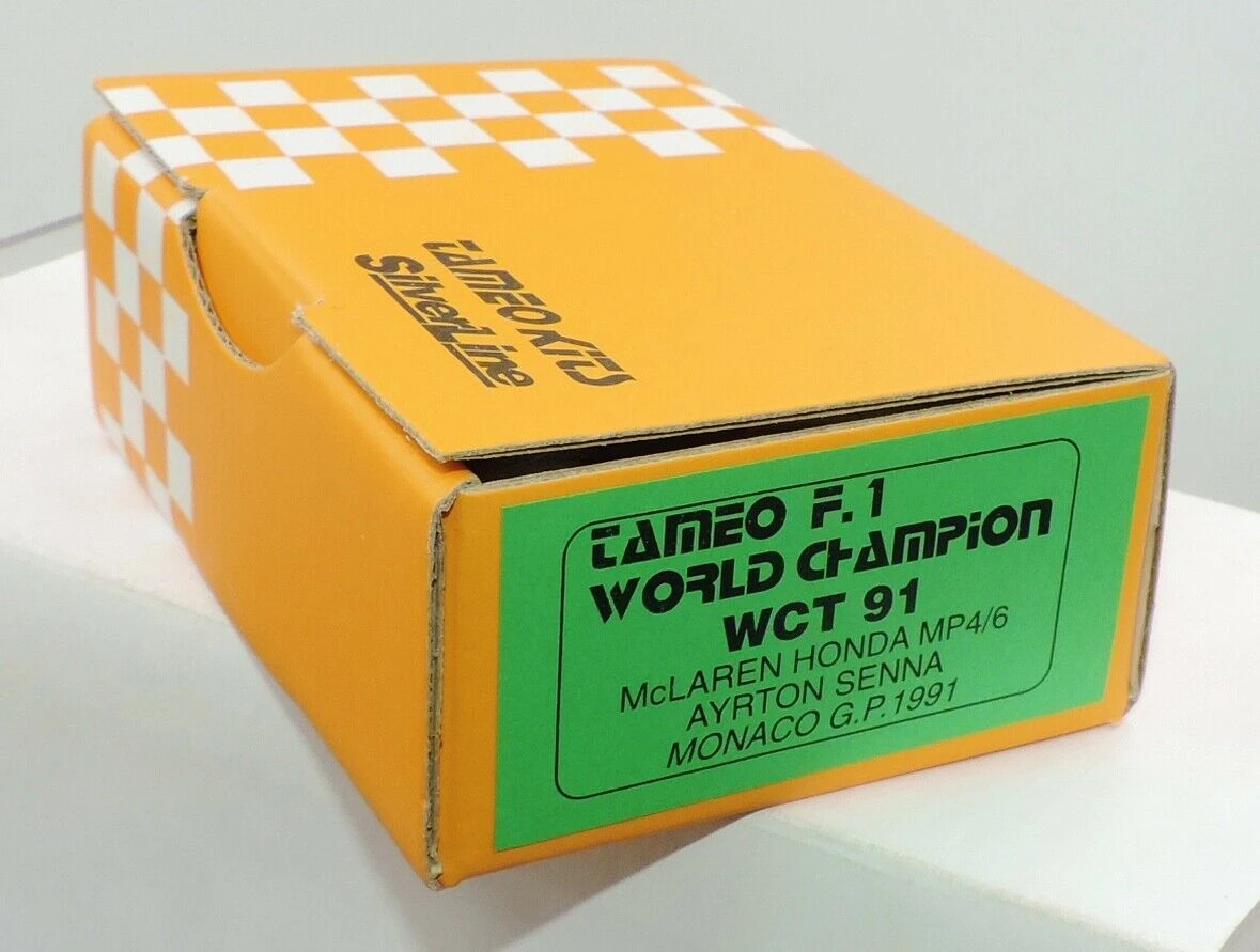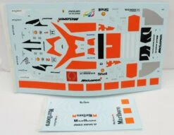 This white metal kit is a replica of a McLaren Honda MP4/6 Formula 1 race car driven and won by Ayrton Senna in the 1991 Monaco Grand Prix. Kit includes photo etched parts, decals and instructions. Photos of the actual car are shown still sealed in the clear plastic packaging and may not be clear. Car Length 4″ and must be completely assembled. Kit weighs 6 oz.
